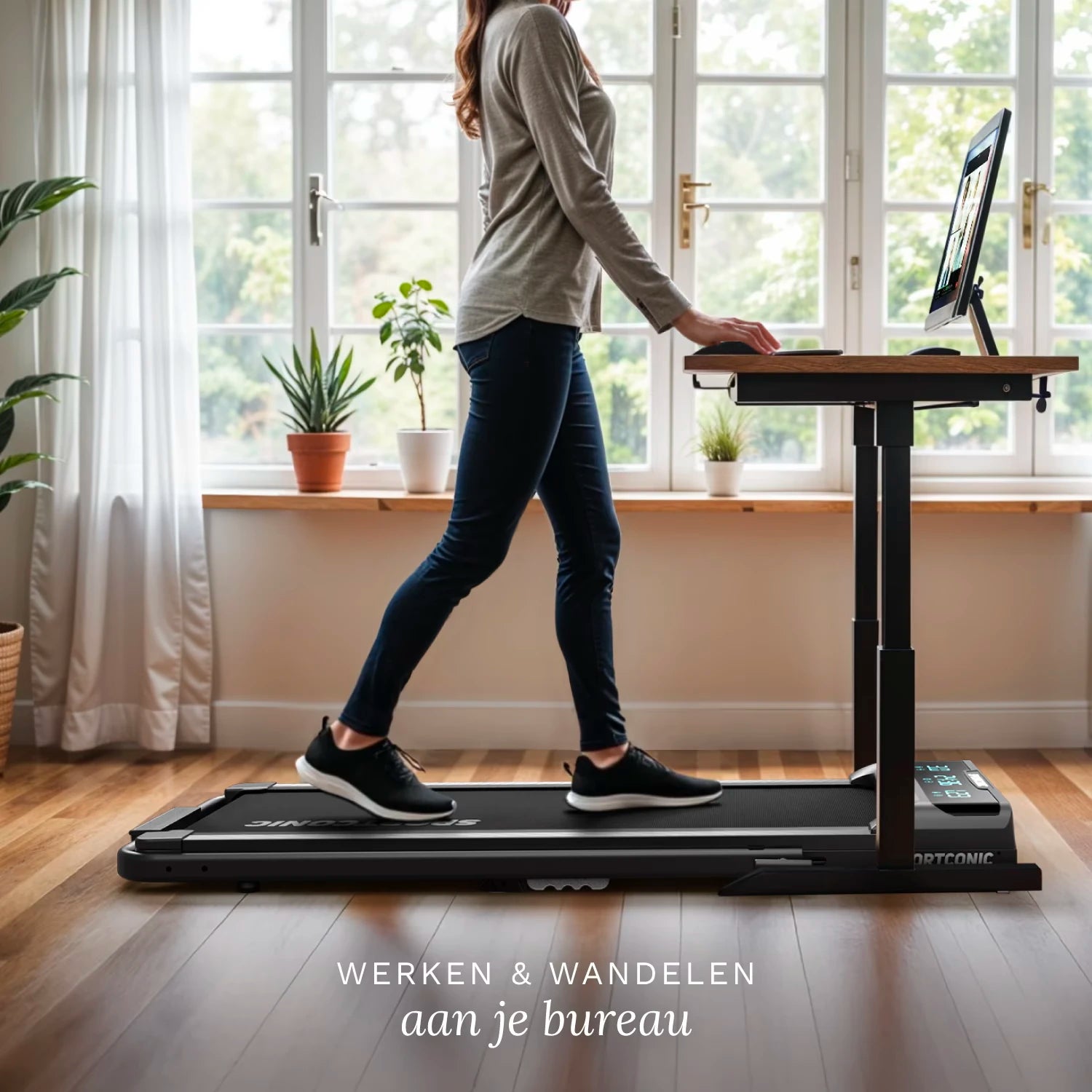 Wissel zittend werk moeiteloos af met actief bewegen, zonder je ritme te onderbreken. De loopband past perfect onder een zit-sta bureau en maakt het mogelijk om te wandelen terwijl je werkt, vergadert of belt.