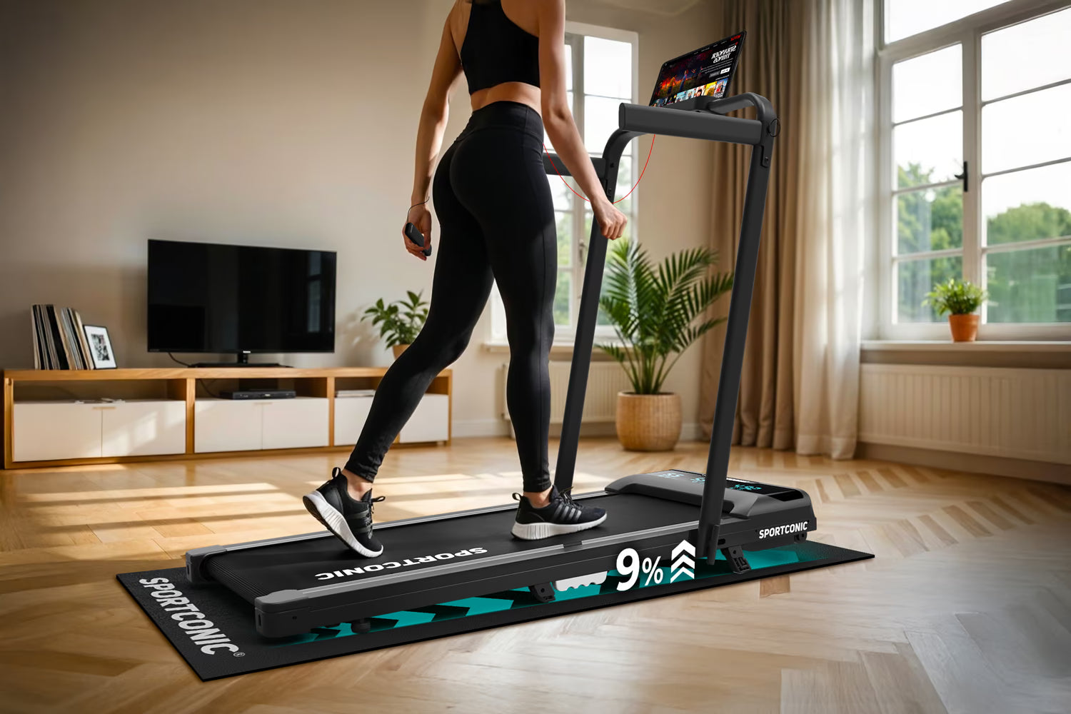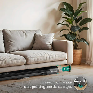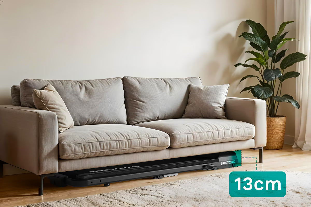 De loopband is ideaal voor thuisgebruik dankzij het slimme en compacte ontwerp. Met een ingeklapte hoogte van slechts 13 centimeter schuif je hem moeiteloos onder een bank, bed of kast. De geïntegreerde wieltjes maken verplaatsen snel en moeiteloos, zelfs in kleinere woonruimtes.