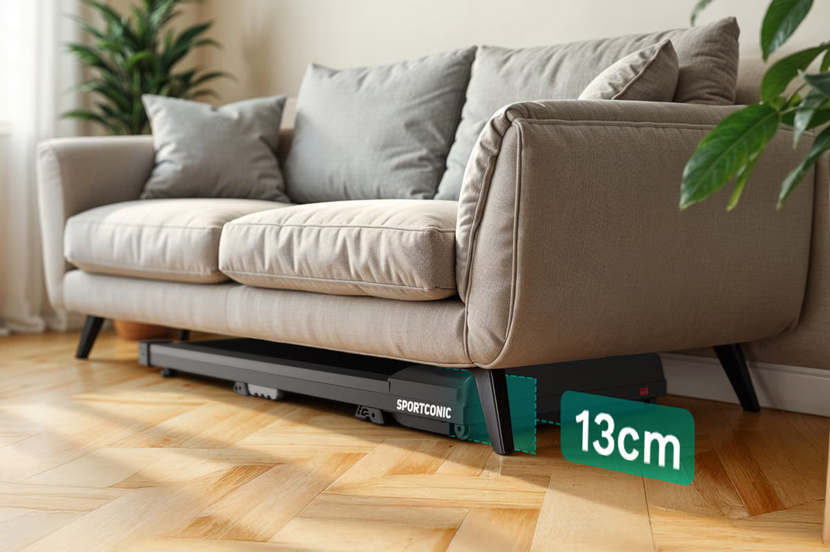 De wandelband is ideaal voor thuisgebruik dankzij het slimme en compacte ontwerp. Met een hoogte van slechts 13 centimeter schuif je hem moeiteloos onder een bank, bed of kast. De geïntegreerde wieltjes maken verplaatsen snel en moeiteloos, zelfs in kleinere woonruimtes.